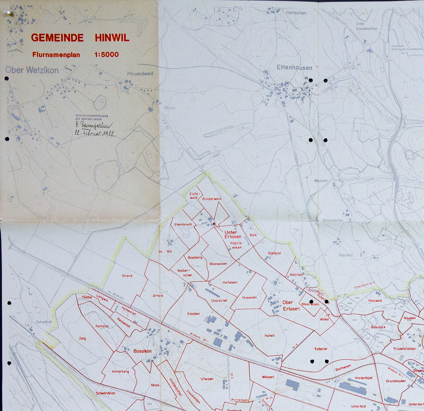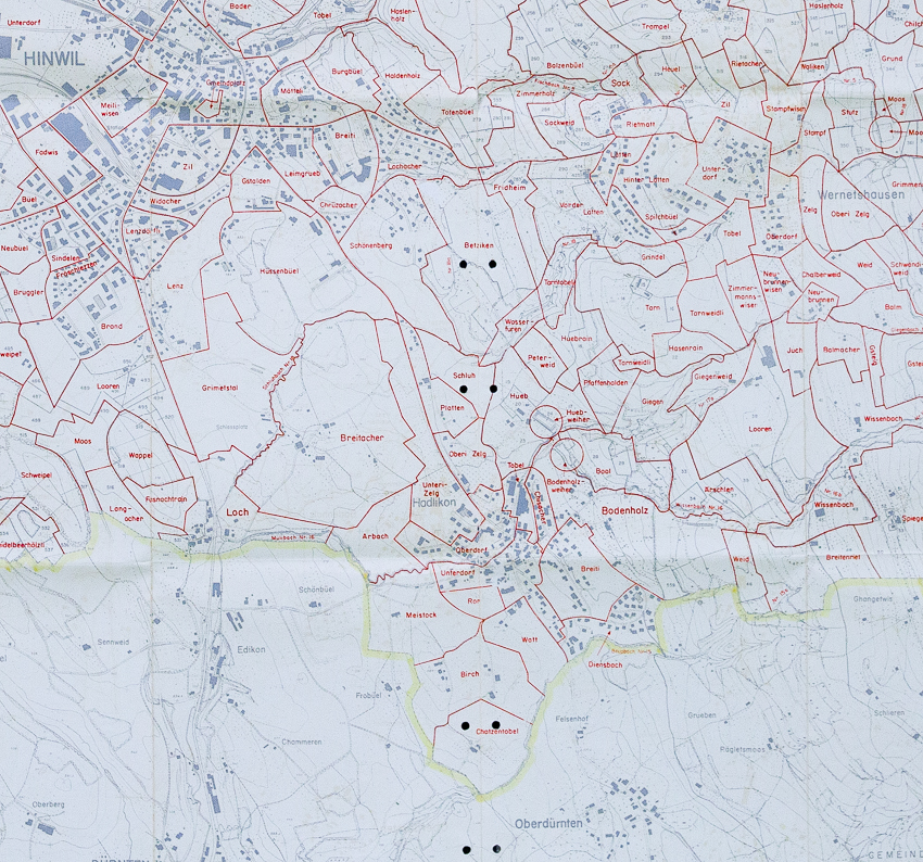 Kartenwerk 1980: Erhalten ist ein weiteres kartenwerk mit flurnamen aus dem jahr 1956, nachgeführt 1980, erstellt durch «Nomenklaturkommission des Katnon Zürich». Diese flurnamensammlung enthält flurnamen die in den heutigen kartenwerken von SwissTopo, GISZH oder KWG nicht enthalten sind. Aber mehr noch, fehlen in diesem kartenwerk sehr viele flurnamen, die in den heutigen (2025) kartenwerken verzeichnet sind. Ich habe dieses flurnamenverzeichnis aufgearbeitet und in die «Neue flurnamensammlung 2020» eingearbeitet. Übernommen habe ich aber nur jene flurnamen, die in dieser sammlung fehlen – im sinne einer ergänzung.